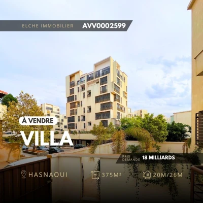 Réf: AVV0002599 À vendre : une villa R+1, entièrement meublée et équipée, située dans la Résidence Hasnaoui, Bir El Djir, Oran. Au prix de 18 Milliards Superficie : 375 m² avec d