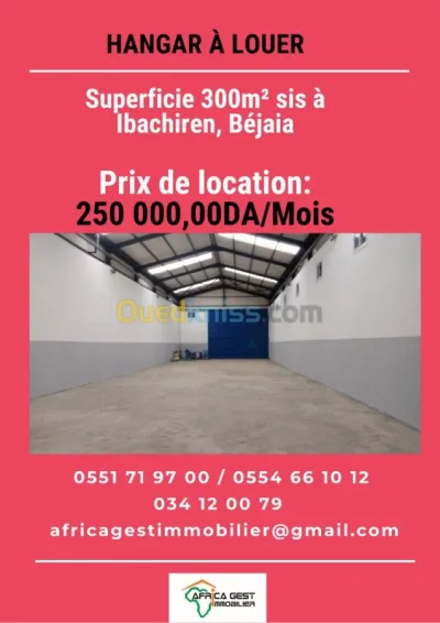 (Réf:LH/325) Ibachiren, commune de Oued-Ghir, à cinq (05) minutes du centre-ville et du port de Béjaia, agence AFRICA GEST loue un hangar clôturé et couvert avec un grand portail d’un
