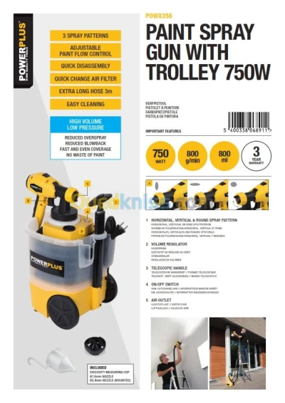 Varo Pistolet peinture a Air avec reservoire Powx358 Caractéristiques: - Système volume élevé basse pression - Système de propulsion d'air intégré. - Longueur du tuyau d'air supp