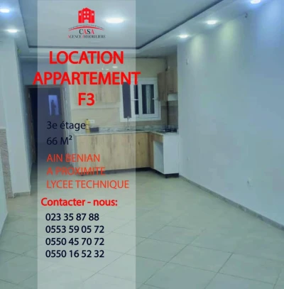 A LOUER: APPARTEMENT F3 - 3E- 66M² - AIN BENIAN. Aïn Benian, à proximité du lycée "Technique", dans une promotion immobilière, Casa Immo met en location un appartement de type F3 au 3