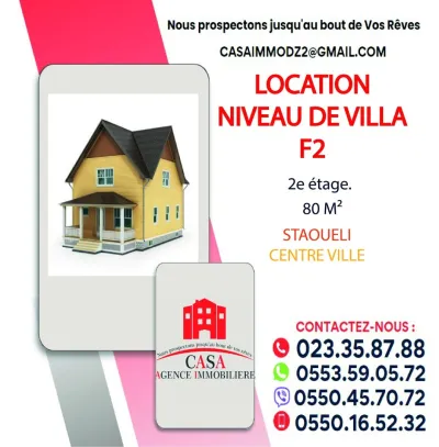 85/170 Ak-immobilier met en location f2 niveau de villa d'une superficie de70m² au 4 Emme et dernier avec une grande terrasse idéal pour habitation ou situé à staoueli Pour plus de déta