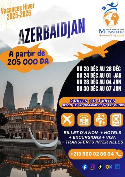 ✨ 𝗝𝗮𝗻𝘃𝗶𝗲𝗿 𝟮𝟬𝟮𝟲 ✨ en #Azerbaïdjan 🇦🇿 ✈ 💰💰💰 𝗮̀ 𝗽𝗮𝗿𝘁𝗶𝗿 𝗱𝗲 𝟮𝟬𝟵 𝟬𝟬𝟬 𝗗𝗔 💰💰💰 Avec