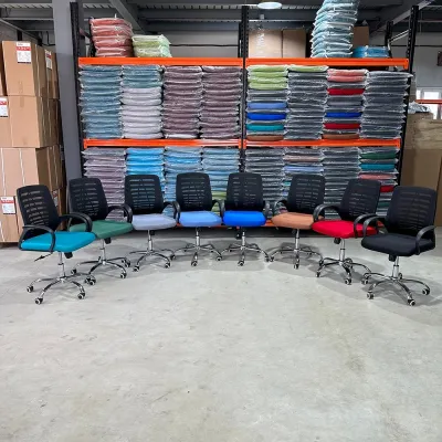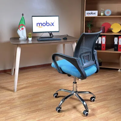 Chaise Opérateur en tissu BLEU CLAIRE avec le dos en filet couleur noir, design ergonomique avec support lombaire très confortable. كرسي المكتب ذو ظهر من الشبك لون