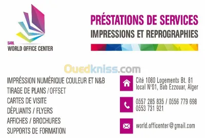Tous travaux de conception et impression et de publicité : - Impression offset carte visite ,flyer et dépliant + etiquette Autocollant xerox A3+ 45*32