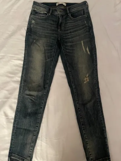 Jean slim ZARA pour femme, couleur bleu vintage avec un léger effet délavé et des touches usées pour un style rétro et tendance. Coupe ajustée, tissu confortable et doux. En très bon