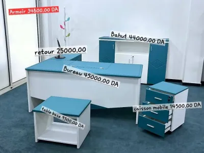 Ensemble de bureau moderne, disponible en 1m40 et 1m60 Avec retour caisson + armoire pleine assortie ! Un design élégant, pratique et 100% algérien – idéal pour vos espaces de travai