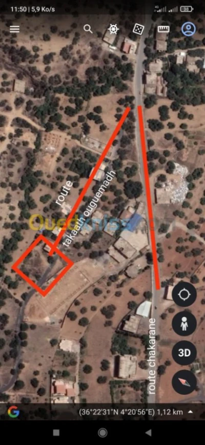 Chourfa : Quartier chakarne Terrain à takaath ouguemadh à 220 m ver a la commune de chourfa et ver daira tazmelt 550 m et le route jusqu'à a la place de Terrain.