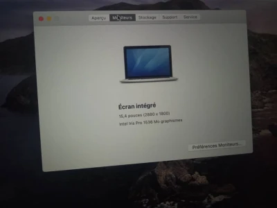 MacBook Pro Nom Processeur Graphisme Mémoire Numéro de série macOS macOS Sequoia Moniteurs Écran Retina intégré MacBook Pro de MAC 1,4 GHz Intel Core i5 quatre cœurs Intel Iris Plus