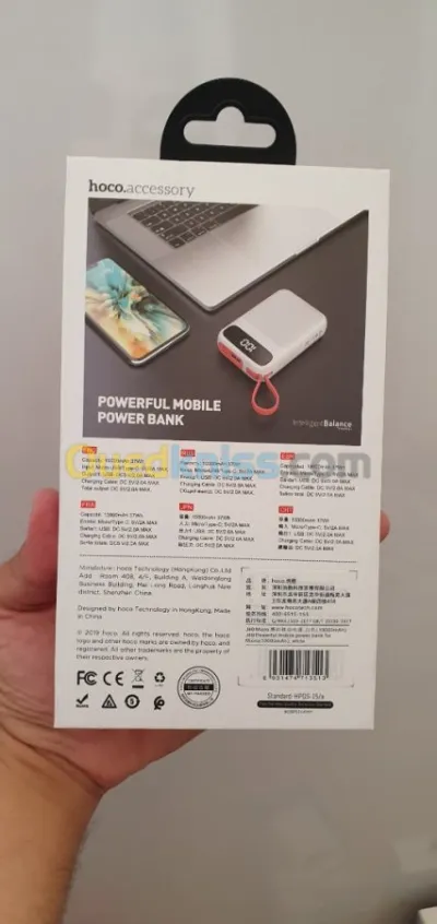 سعة 10000 mAh (فعليًا تقريبًا 6200 mAh) مدخلان: Type‑C وMicro‑USB (5 V/2 A) 4 مخارج: USB‑A وثلاث كابلات مدمجة