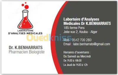 Laboratoire d'Analyses Médicales Dr K. BENHARRATS situé au 185 Ferme Pons Jolie Vue 2, Kouba Alger ( A proximité de l'autoroute en face de l'Hopital Ain Naadja juste aprés la station