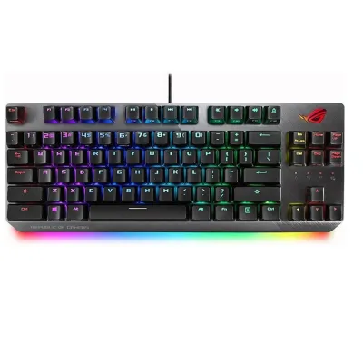 Visez la victoire avec le clavier gamer ASUS ROG Strix Scope RX TKL Wireless Deluxe ! Ce modèle au format TKL et parfaitement adapté pour le FPS se pare de switches opto-mécaniques rouges