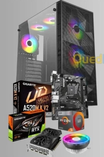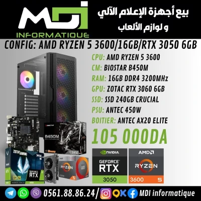 CPU: AMD RYZEN 5 3600 CM: ASUS B450M-K ii RAM: 2X 8GB DDR4 3200MHz ADATA GPU: NVIDIA RTX 3050 6GB SSD: SSD 256GB PSU: GAMDAIS AURA GP450 PRO BOITIER: GAMDIAS AURA GC2 ELITE