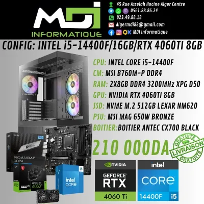 CPU: INTEL CORE i5-14400F CM: MSI B760M-P DDR4 RAM: 2X8GB DDR4 3200MHz XPG D50 GPU: NVIDIA RTX 4060TI 8GB SSD: NVME M.2 512GB LEXAR NM620 PSU: MSI MAG 650W BRONZE BOITIER:BOITIER ANTEC CX700