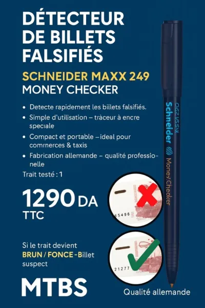 Schneider Maxx 249 Money Checker Stylo détecteur d'argent blanc : Un trait clair signifie un "billet de banque authentique", le trait gris ou brun signifie que c'est un "billet de banque fa