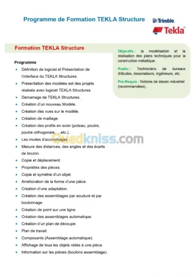 Je suis à votre disposition en cas besoin d'éventuel Formateur/Consultant dans le domaine Charpente "Tekla Structure" Ci-joint le programme de la Formation