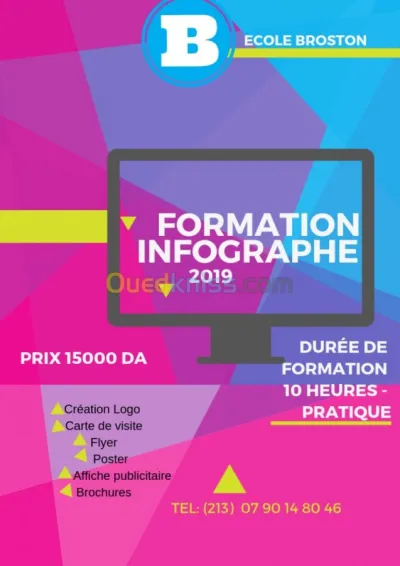 L'Ecole Broston sis à ES Senia Oran vous propose les formations suivantes : * Formation Infographe : Conception et création carte visite, flyer, brochure, menu, affiche publicitaire, p