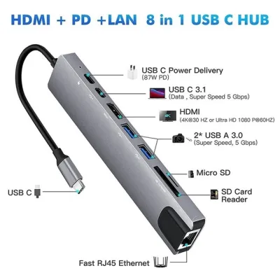 ADAPTATEUR (8 IN 1) TYPE-C TO RJ45+TYPE-C*2+SD CARD+USB3.0*2+HDMI 8 in 1 USB C Adapter with 4K HDMI, 100W PD, USB C Port, USB 3.0, RJ45 Ethernet, SD/TF Card Reader, Docking Station Compati