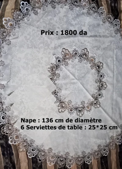 Nappe en parfait état, mesurant 1360 cm de diamètre, avec 6 serviettes de table de 25*25 cm incluses.