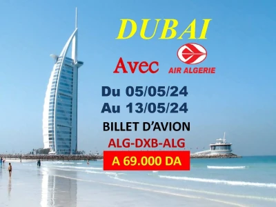 VENTE BILLET D'AVION ALGER /DUBAI AVEC AIR ALGÉRIE DU 05-05-2024 AU 13-05-2024 Prix : 69.000 DA Plan de vol: Départ 22:05 arrivée 07:50 Retour 09:50 arrivée 14:30