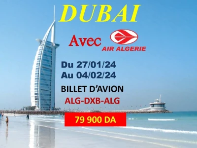 VENTE BILLET D'AVION ALGER /DUBAI AVEC AIR ALGÉRIE DU 27-01-2024 AU 04-02-2024 Plan de vol: Départ 22:05 arrivée 07:50 Retour 09:50 arrivée 14:30
