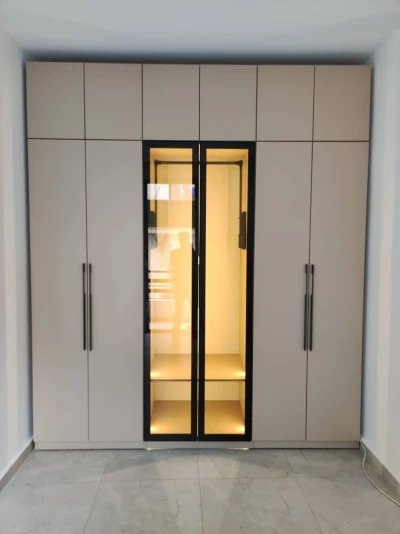 Découvrez cette armoire dressing sur-mesure qui maximise l'espace de votre chambre ou entrée avec un design contemporain et une fonctionnalité optimale. Cet aménagement intérieur offre