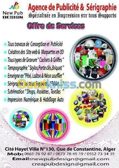 nous sommes une société basée a la cite ali sadek bek alger ,nous sommes spécialises dans les travaux de communication et de publicité :impression numérique sur tous support,banners,lo
