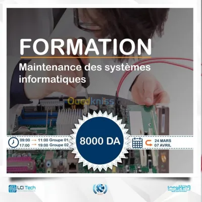 Formation 100 pratique. Groupes réduits. 1- Maintenance des Microordinateurs de bureaux (30 h / 5 jours). Problèmes Soft et hard. Coût de la formation : 20 000 DA. 2- Installt