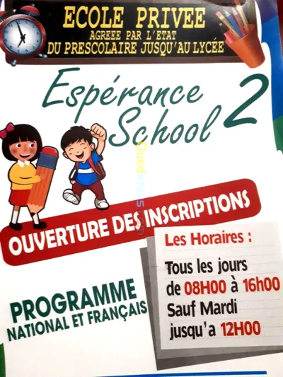 Ouverture Septembre 2019 d'une ecole privée : ESPERANCE SCHOOL 2. L'école esperance school 1 située à Tizi-ouzou a fait ses preuves avec 100% de réussite aux examens nationaux. Pr