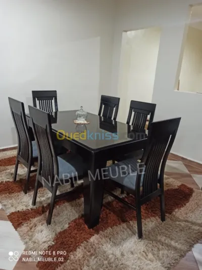📝 Fiche Technique – Table avec 6 Chaises 📌 Caractéristiques générales : • Type : Table à manger avec 6 chaises • Fabrication : Locale 🇩🇿 🪵 Matériaux : • Table :
