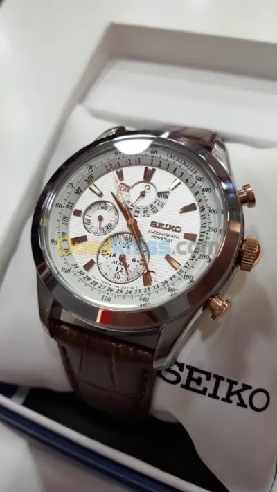 Model 7t86-0ac0 Chronographe Seiko Neo Classic avec calendrier perpétuel. Sous-cadrans affichant 60 secondes, 60 minutes, 24 heures et alarme. Un sous-cadran de jour de la semaine est so