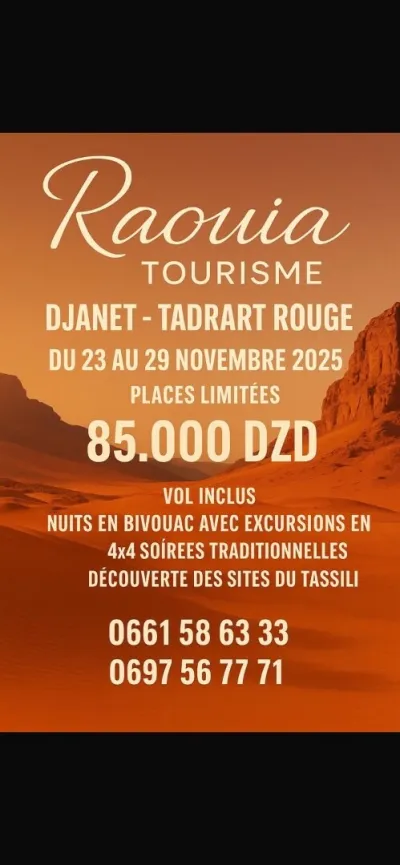 Partez à la découverte du Sahara magique avec Raouia Tourisme! Du 23 au 29 novembre 2025, vivez une expérience inoubliable à Djanet et la Tadrart Rouge — un voyage au cœur des plus