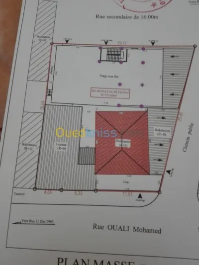 بيت للبيع في وسط مدينة البليدة مساحته 755 متر مربع له ثلاث واجهات مطل على شارع محمد بوضياف (BV de 20 mètre)