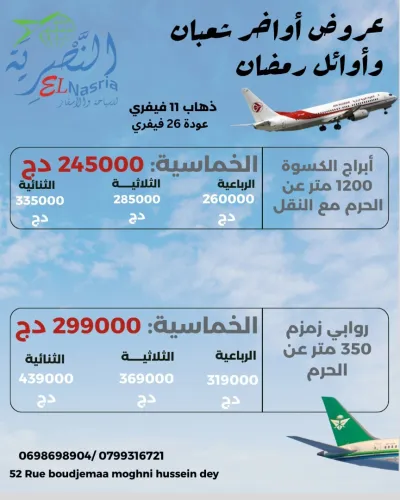 🕋 Offre Omra exceptionnelle – Fin Chaâbane & Début Ramadan 🕋 ✨ Une opportunité spirituelle unique pour vivre les premières bénédictions du mois sacré ✨ El Nasria Tours –