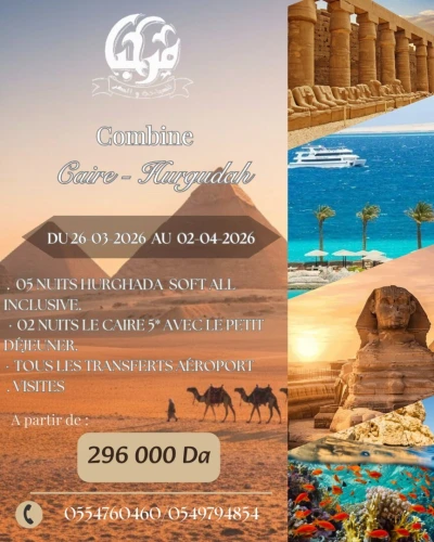 Offrez-vous une expérience unique en Égypte alliant culture, histoire et détente balnéaire. 📅 Dates du séjour : Du 26 mars 2026 au 02 avril 2026 🏨 Programme : 05 nuits à Hurgh