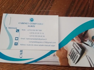 Cabinet de comptable agréé sis à (EL HAMIZ DAR EL BEIDA), offres des services fiables et efficace, opère par déplacement ou par internet, pour entreprise ou particulier; pour toutes act