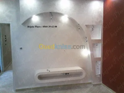 Pour tous vos travaux d'aménagement et de décoration: - cloison et contre-cloison ; - plafond fixe et démontable ; - meuble TV, et bibliothèque en placo ; - Etagères; - Comptoirs;