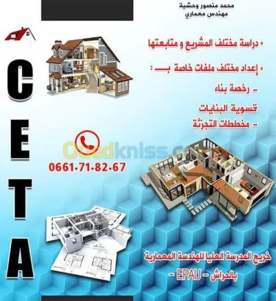Tout etude concernant le batiment 1-Permit de construire 2- régularisation des batiment dans le cadre 08/15 3-Etude architectural +genie civil+ces+vrd+3d. 4-cetaficat d'urbanisme 5-