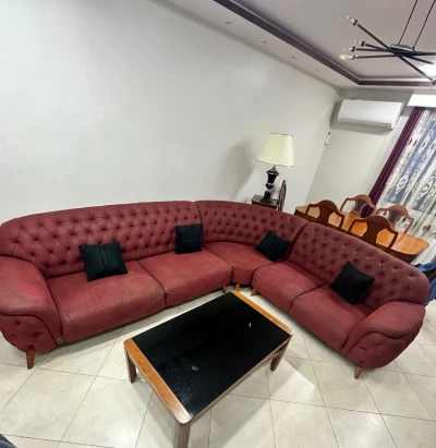 Salon d’angle en très bon état, propre et bien entretenu. Confortable et élégant, idéal pour un salon familial. • État : très bon • Couleur : bordeaux • Salon spacieux et c