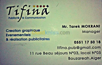 Notre entreprise est specialisée dans le secteur de la communication et la publicité. Dans ce cadre d'activité, elle s'occupe de la conception et la realisation. Nos services ont pa