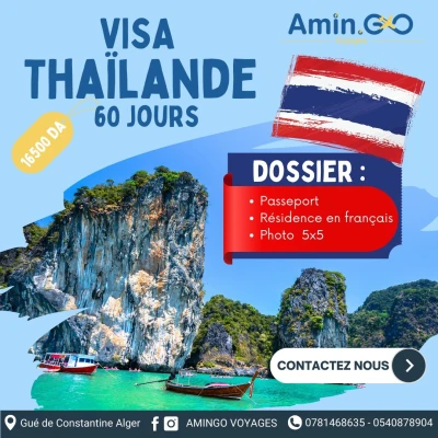 Découvrez nos offres exclusives pour le e-visa Thaïlande et Indonésie et voyagez avec Amingo Voyages! visa Thaïlande : Prix : 16 500 DA Documents requis : - Passeport - Photo 5x5 -