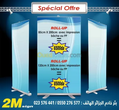 promotion rollup en structure alluminium avec enroulement automatic premier coix et avec limpression numérique en bache ou en pp papier indéchirable y compris et a seulement 6500da pour
