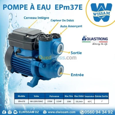 Pompe à Eau Périphérique Automatique La marque AQUASTRONG Avec la pompe EPm37E, vous n'avez plus besoin d'un Cerveau matqiue - Type : EPm37E. - Débit max : 33 (l/min). - Hauteur : 35 m