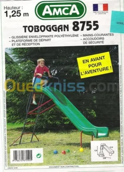 Balancoires et toboggans importes de France .Pour creches ecoles,jardins d enfants et pour jardins de villa. Jeux pour deux jusqu'a 6 enfants . Les prix varient entre 45000 et 65000Da.