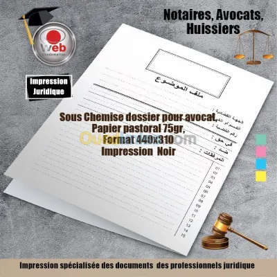 impression juridique pour Avocats, huissiers, notaires. nous vous proposons des Chemise dossier et sous chemise pour avacat Chemise dossier 32x48cm, papier bristol 250gr, couleur jaune, ve