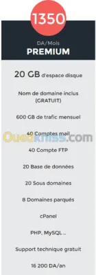 20 GB d'espace disque Nom de domaine inclus (GRATUIT) 600 GB de trafic mensuel 40 Comptes mail 40 Compte FTP 20 Base de données 20 Sous domaines 8 Domaines parqués cPanel PH