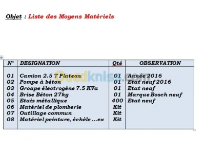 Equipe constituée d'un personnels jeunes et qualifiés notamment Dans les travaux du gros oeuvre ,réalisation des Poteau et dalles en béton . le matériel nécessaire pour effectue