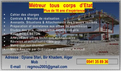 Métreur tous corps d’Etat Plus de 16 ans d’expérience j'offre mes service pour : ✅ Cahier des charges, Contrats et convention ✅ Marché de réalisation ✅ Avenants ✅ Prépar