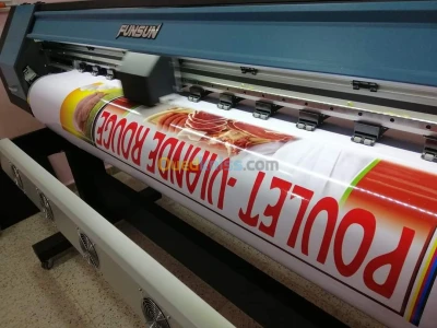 Impression grand format sur bache autocollant , one way , flex impremable , tissu flag Impression et decoupe flex et autocollant Réalisation : des flag ( goute flech et rectangle) Rol