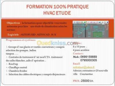 Objectives : la formation a pour objectif de vous rendre autonome pour faire une étude de climatisation selon les normes . Logiciels : AUTOFLUID . AUTOCAD . H-X