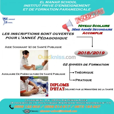 L'école de paramédicale Ibn badis sétif lance les inscriptions pour les formations suivantes: * Aides -soignants de santé publique * Auxiliaires de puériculture de santé publique dur�
